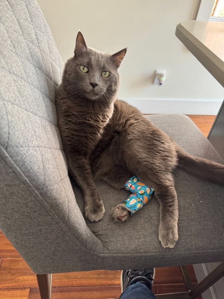Blurb:Ash is a 7 year old Russian Blue mix who sustained an injury when he was living on the street which left him with a deformed back foot. He is unable to grow hair on it and the skin there is incredibly thin so he is prone to cutting it open from time to time. He’s a medium sized cat weighing around 11 pounds so we went with the cat sized hock sock. We probably should have measured first because without the hair on his foot it’s a little too big for him. We currently solve this issue by using medical tape to keep the Velcro straps from dangling and giving Ash the opportunity to pull them open. We’re very happy with how the 2 - way strap hock sock with micro fiber fur lining has worked out, and the sushi pattern got so many compliments from his vets.