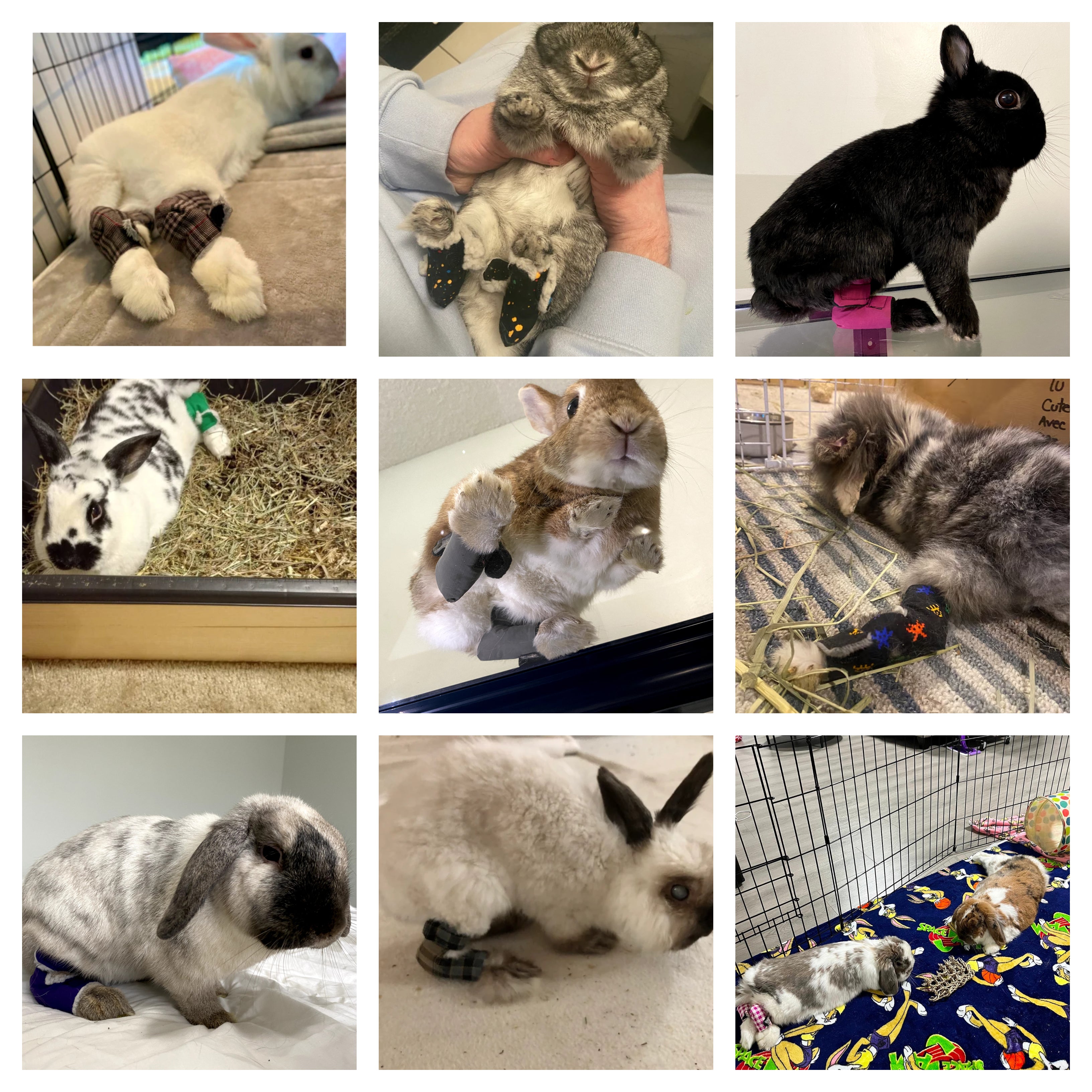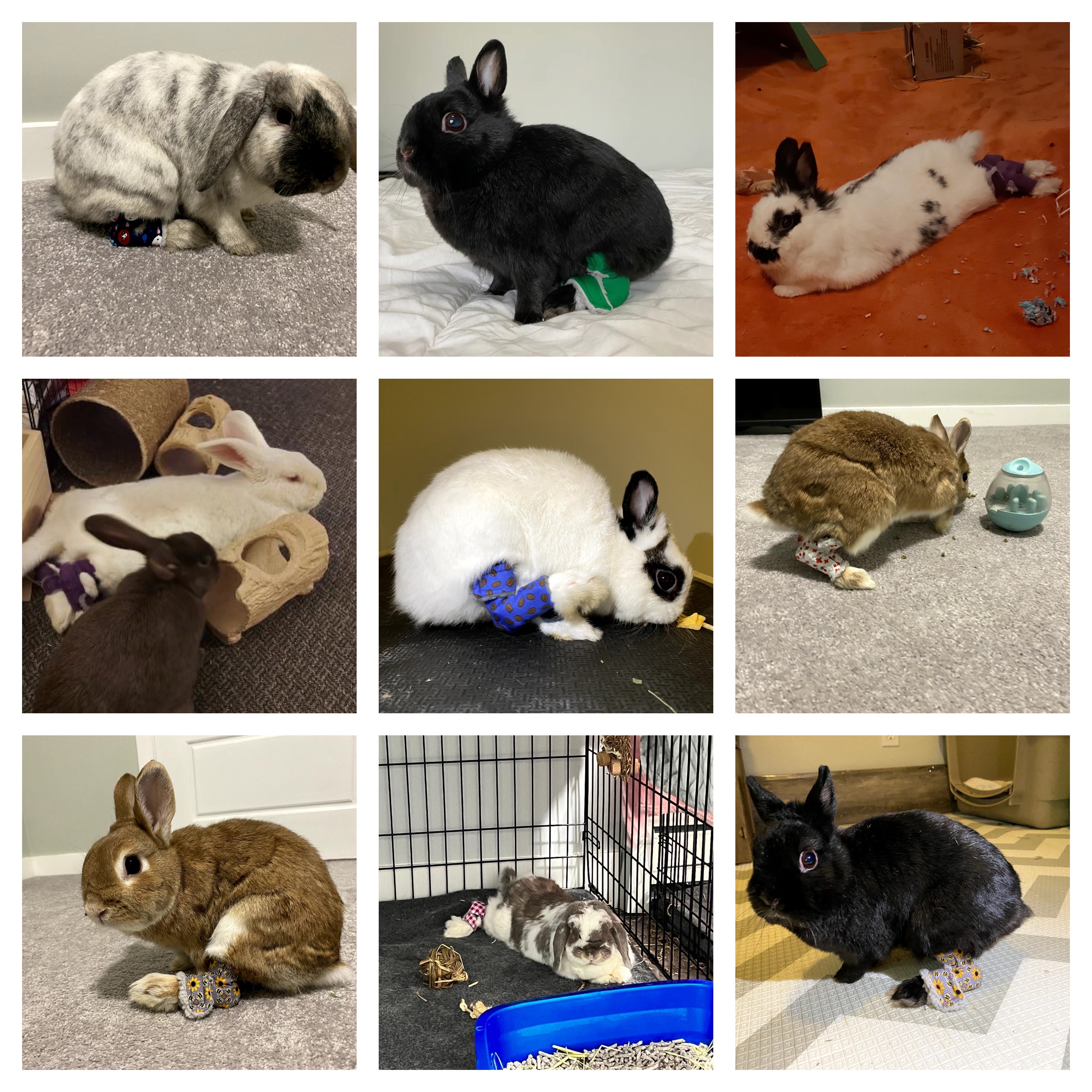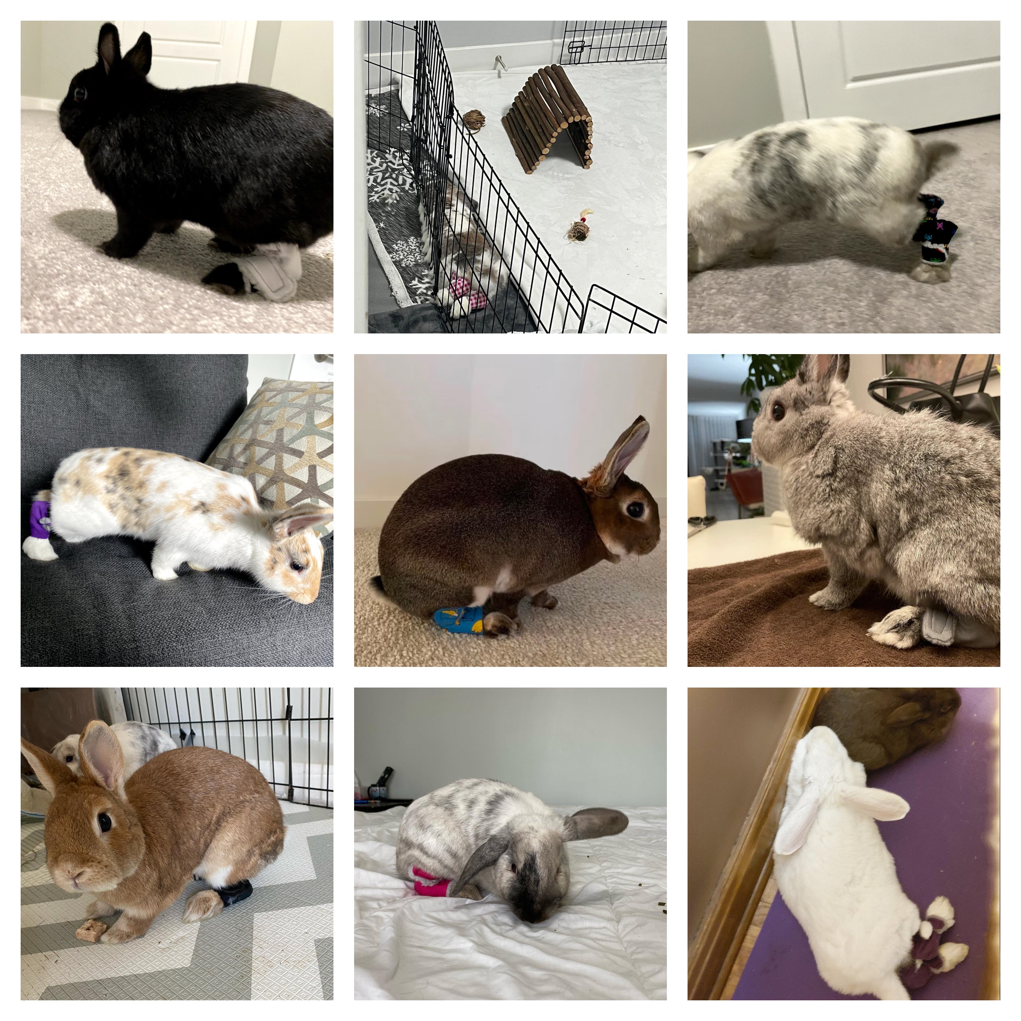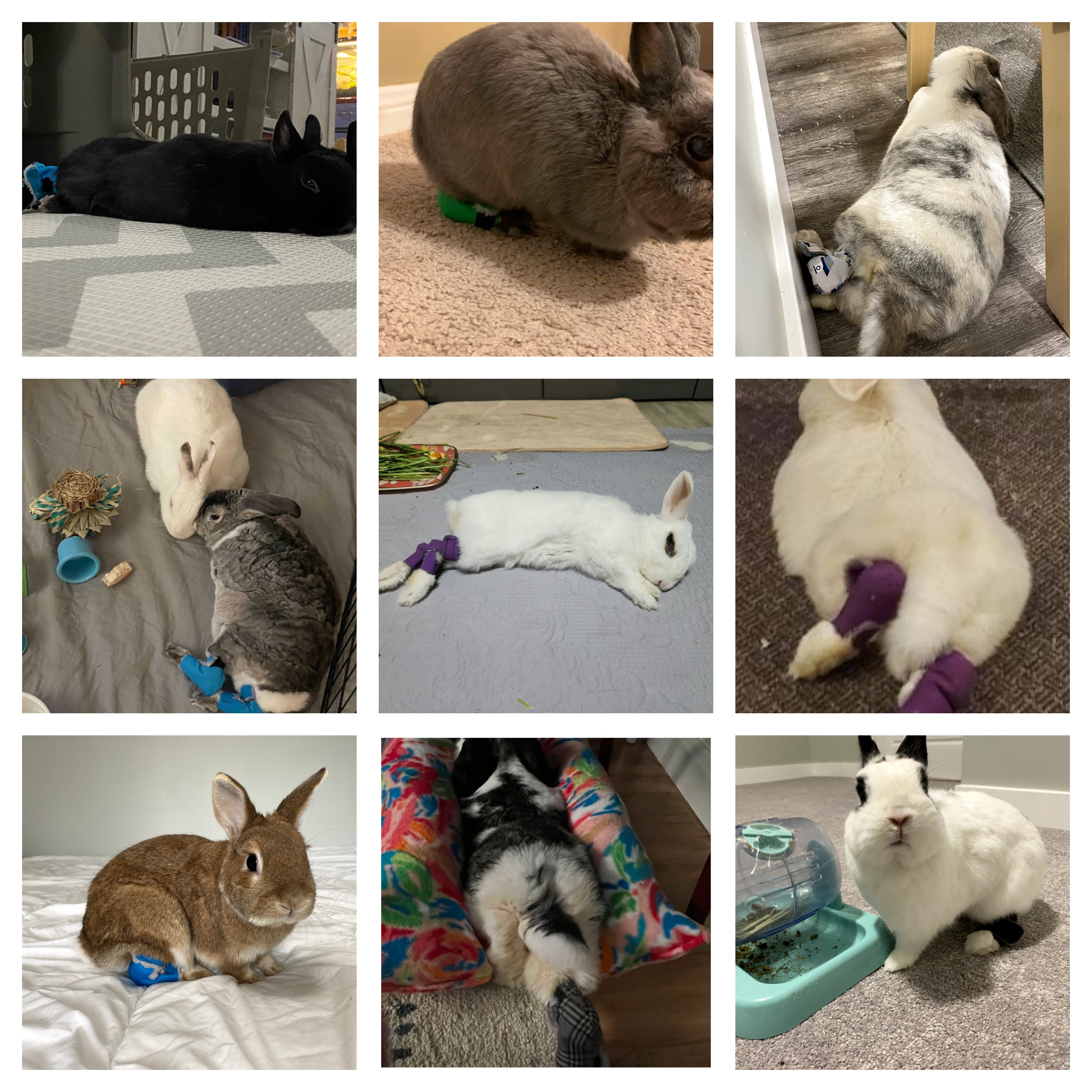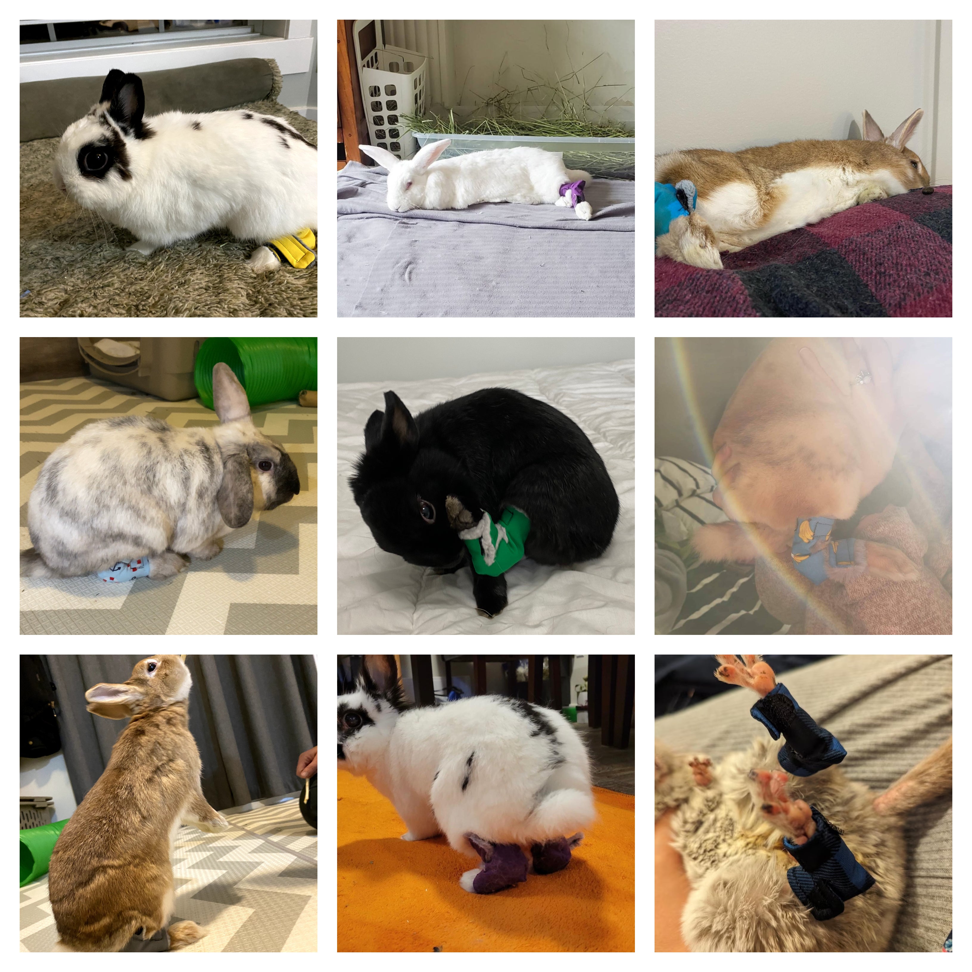 Blurb: Barry is a speedy quick bun, who definitely takes after his namesake, the football star from the 90s, Barry Sanders! Because he loves to run around our carpeted living room, his little Mini Rex feet were starting to develop sore hocks, which got worse when his arthritis kicked in. Fortunately, the socks from One Two Hop have been working really well for him (he wasn't the biggest fan of the two way velcro!), and the fur has started growing on his feet again.