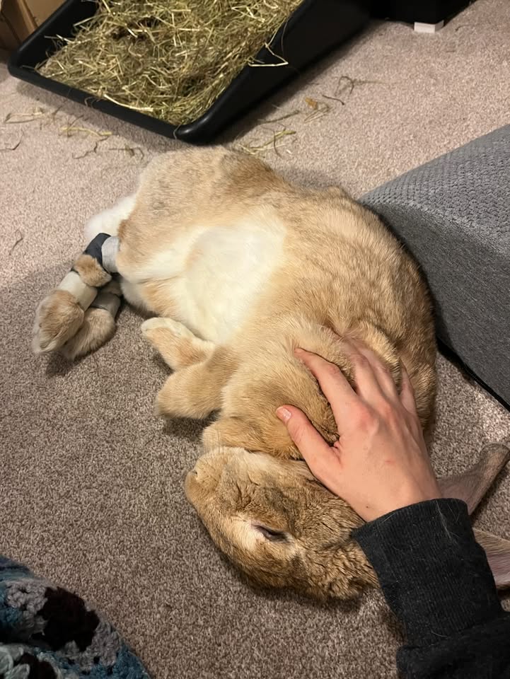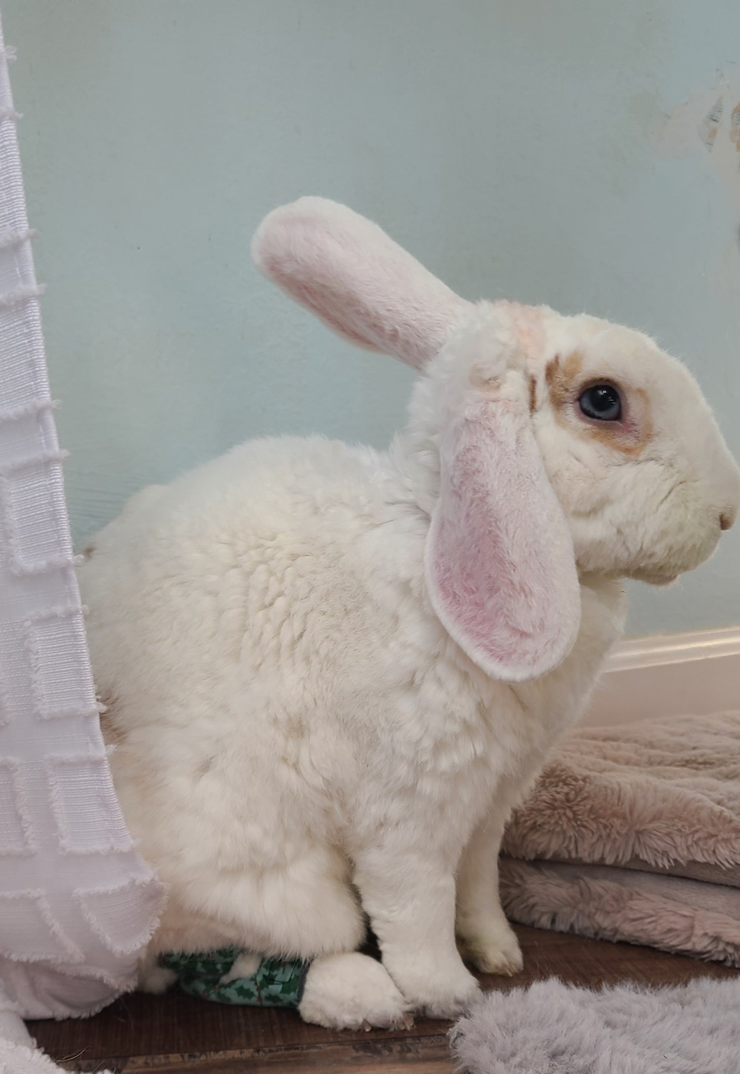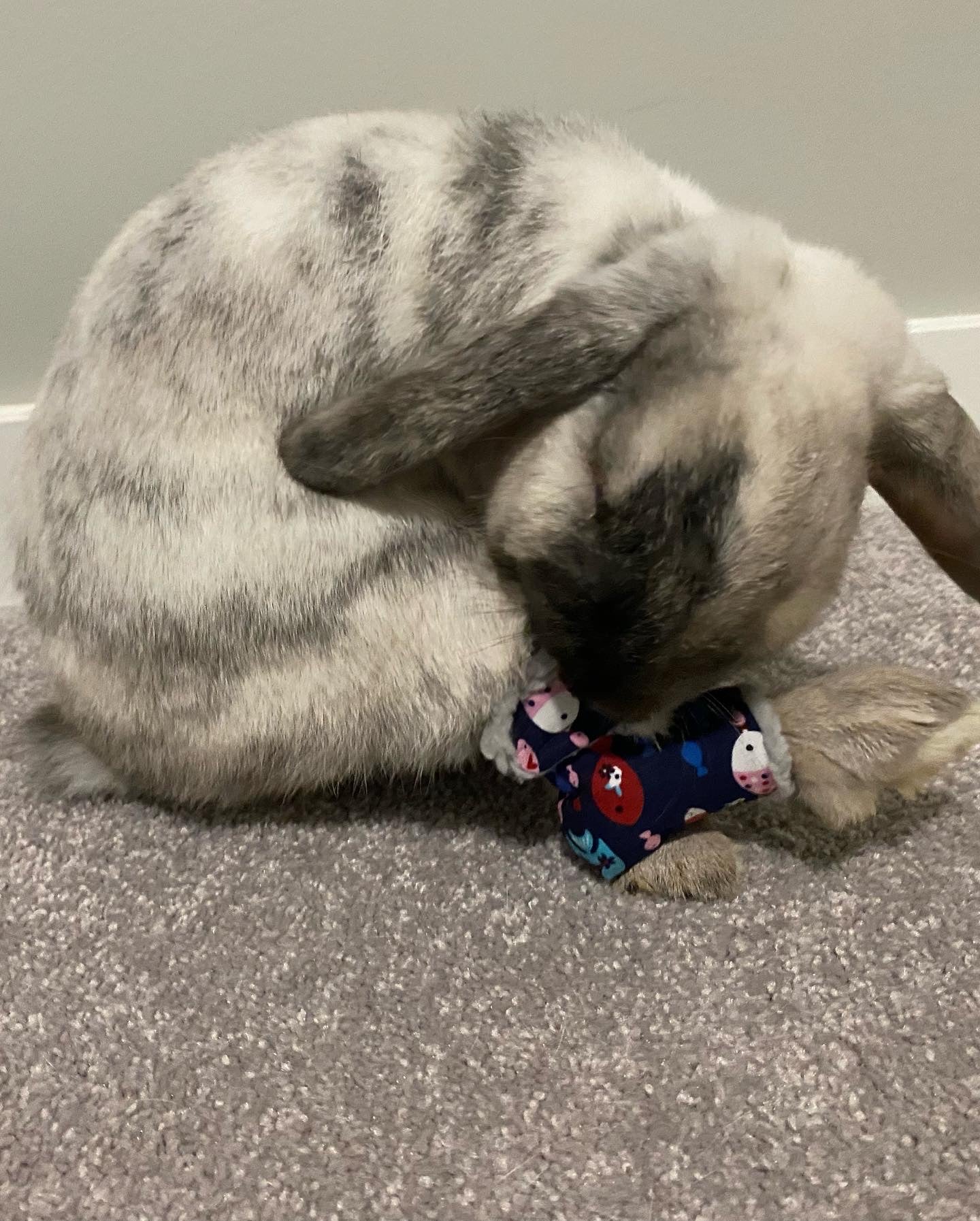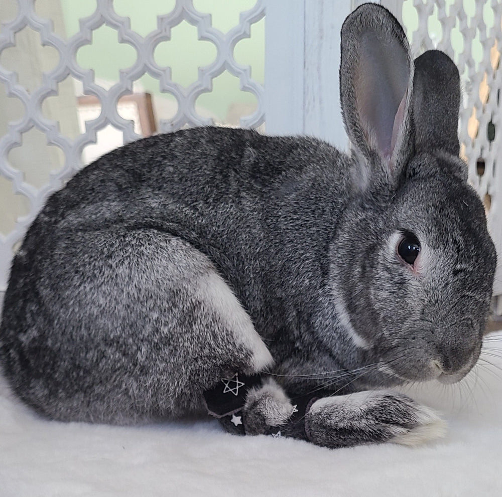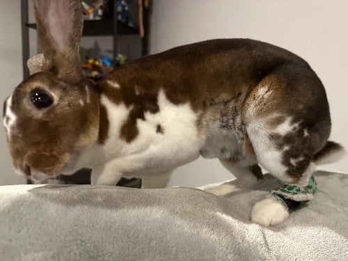 Blurb: Barry is a speedy quick bun, who definitely takes after his namesake, the football star from the 90s, Barry Sanders! Because he loves to run around our carpeted living room, his little Mini Rex feet were starting to develop sore hocks, which got worse when his arthritis kicked in. Fortunately, the socks from One Two Hop have been working really well for him (he wasn't the biggest fan of the two way velcro!), and the fur has started growing on his feet again.