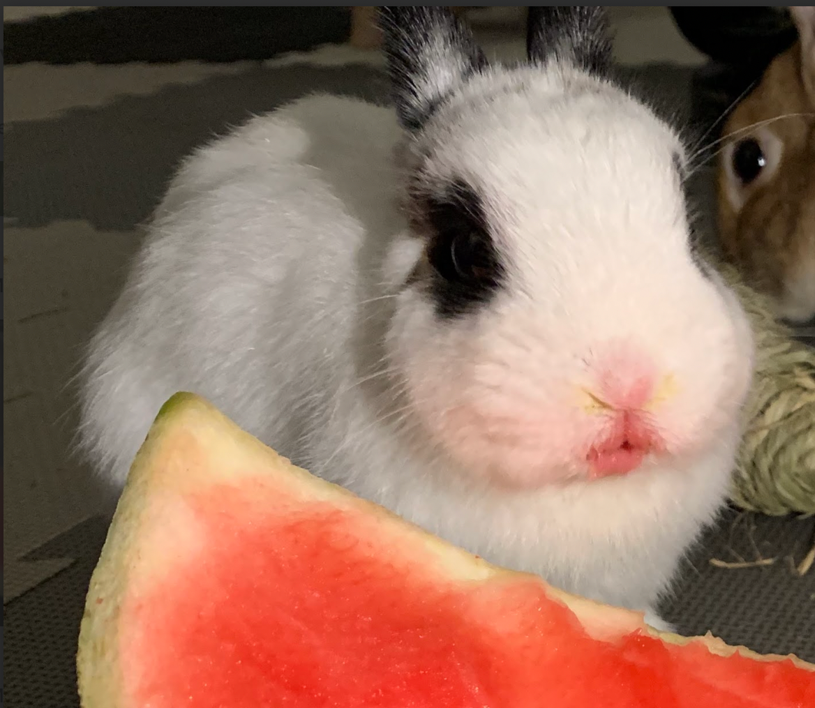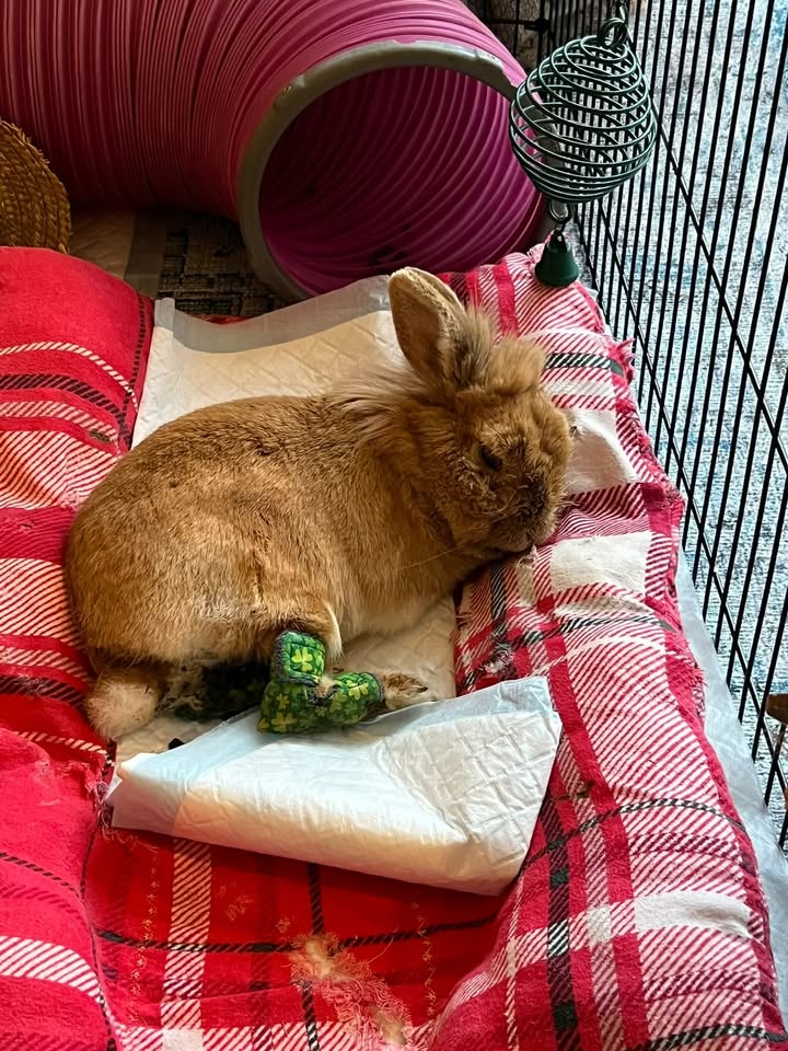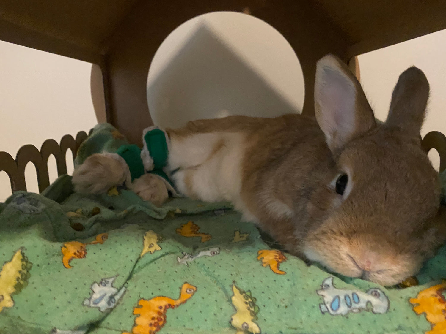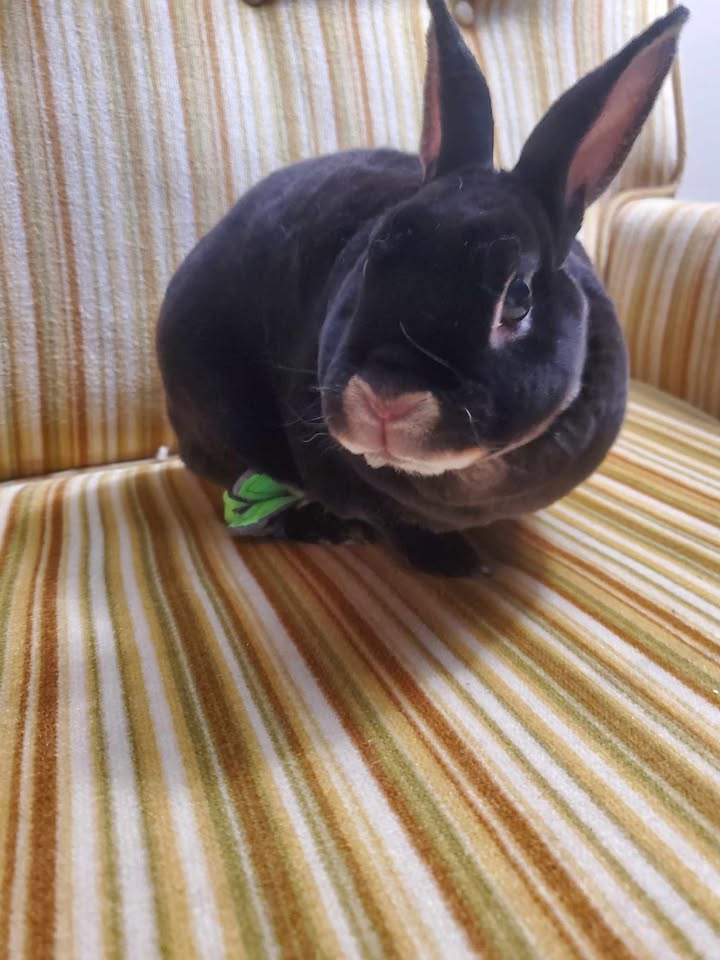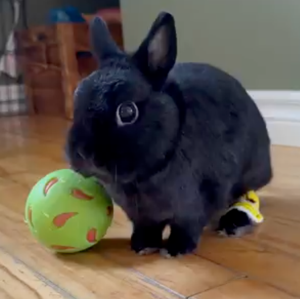 Blurb: Barry is a speedy quick bun, who definitely takes after his namesake, the football star from the 90s, Barry Sanders! Because he loves to run around our carpeted living room, his little Mini Rex feet were starting to develop sore hocks, which got worse when his arthritis kicked in. Fortunately, the socks from One Two Hop have been working really well for him (he wasn't the biggest fan of the two way velcro!), and the fur has started growing on his feet again.